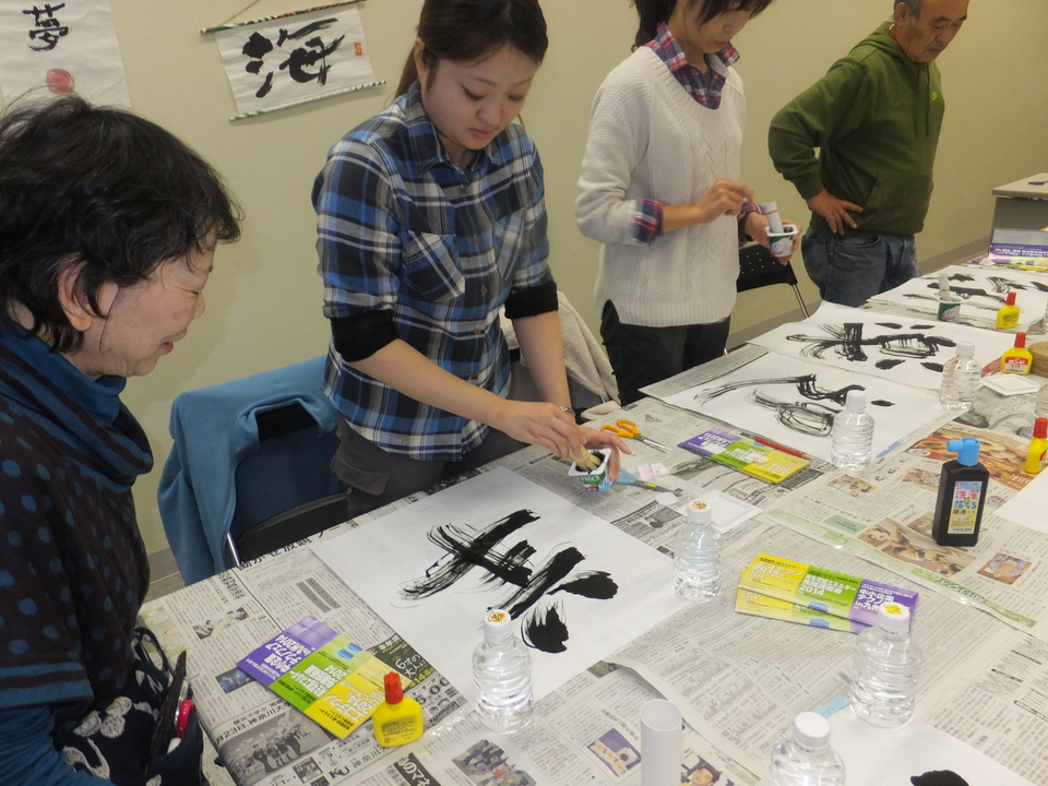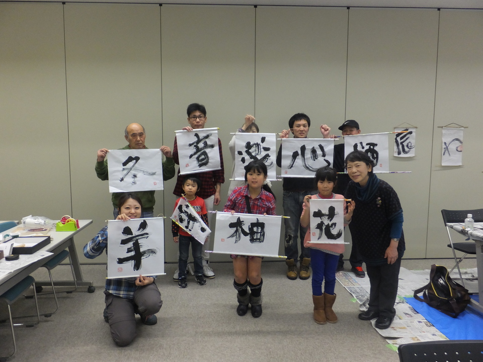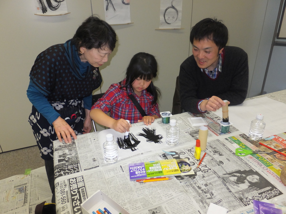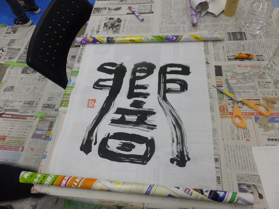 トイレットペーパーの芯の片方をいかの足のように切込みを入れて筆を作り、半紙に思い思いの文字や絵を書きました。食品トレイで落款印をつくって押すと仕上がりがランクアップしました。最後は、古紙を細く巻いた棒を半紙の上下につけて素敵なタペストリーが完成しました!![]()
