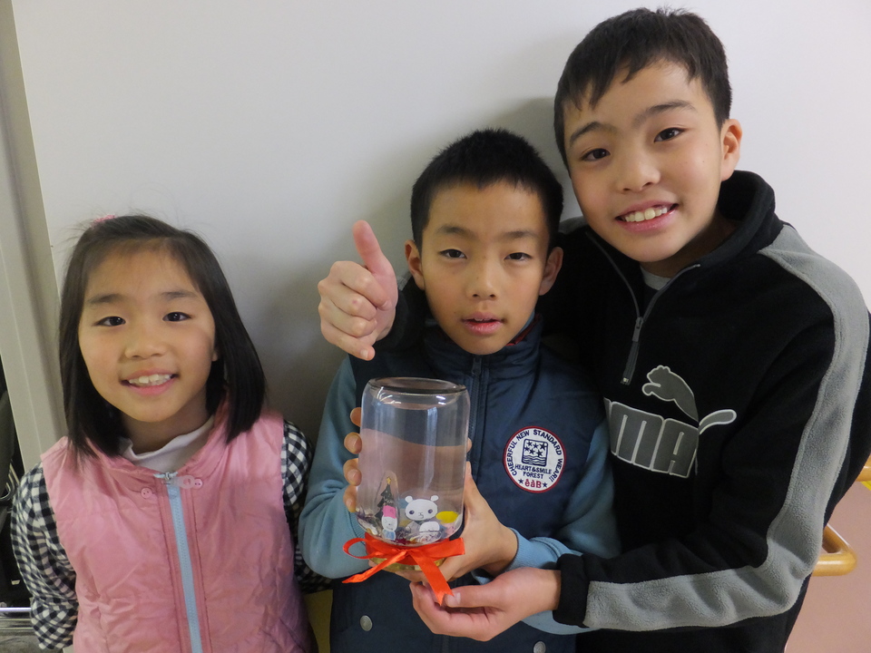 瓶の中には水と洗濯のりを混ぜた液と、宙に舞うように作った小さなオブジェや雪のかわりの物(今回は卵の殻を小さく砕いた物を使いました)などを入れて、そーっとフタを閉じますd(゜_゜)![]()