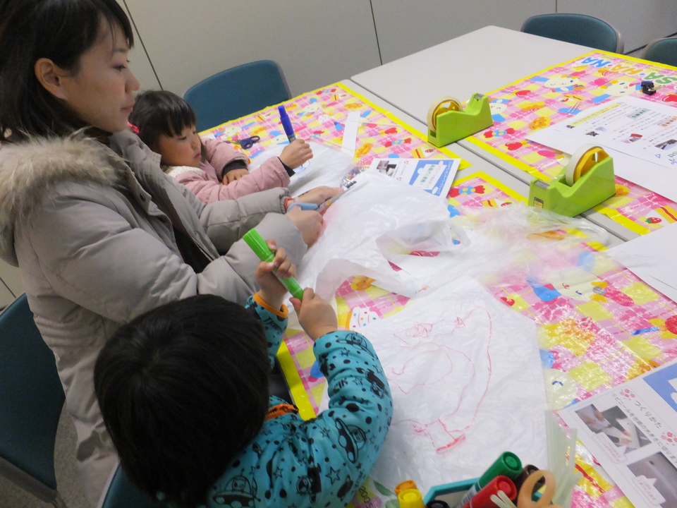 本体になるビニール袋は、スーパーなどでレジ袋として使用されているものを参加者に持参していただきました。あと使用するものは、ストローやつまようじなど。身近にある物でとっても簡単に出来上がります(*^_^*)