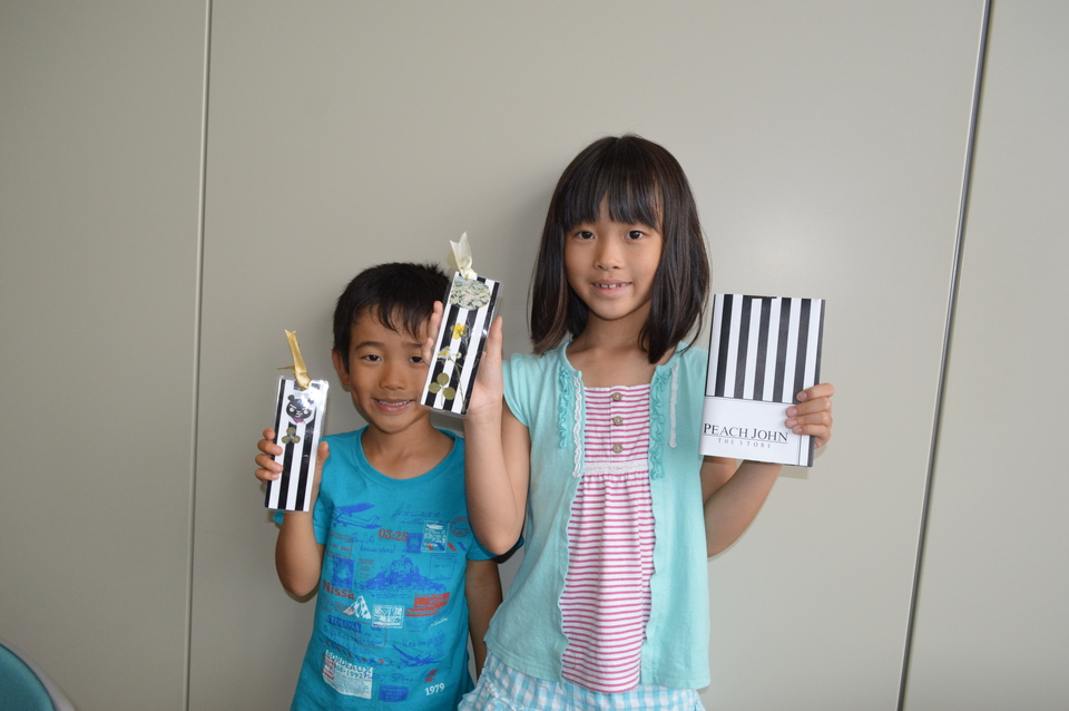 今度は余ったショップ袋を使って、ブックカバーとおそろいのしおり作り☆