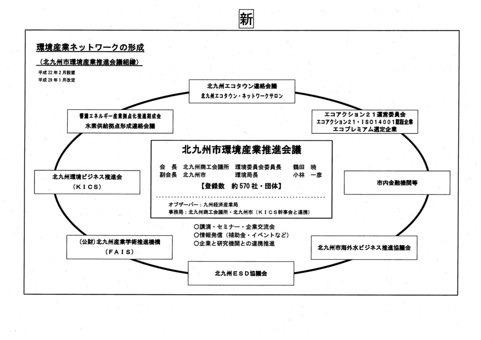 北九州市環境産業推進会議は、環境モデル都市行動計画における5つの柱の一つ「環境が経済を拓く」を具現化していくために平成22年2月に設置され、現在、約570社・団体が登録しています。