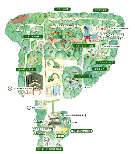 2市1町(三芳町、所沢市、川越市)にまたがる東京ドーム3.7個分の敷地の中には、本業である「建設廃材リサイクル工場」、見学スタート場所となる「交流プラザ」、勉強会や研修会などに利用される「環境塾教室」等たくさんの見学スポットがあります。また敷地面積の87%を占める緑地の一部は、生物多様性豊かな「くぬぎの森」として再生を行っています。