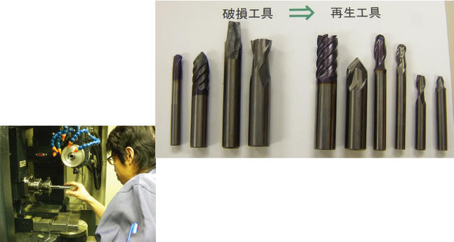 従来廃棄処分していた、破損・使用済み超硬切削工具を回収し、お客様(金属加工業事業者)のニーズにあった切削工具に再加工するサービス。新品工具より安価でお客様に提供し、資源(タングステン等の超硬素材)の有効利用を図る。