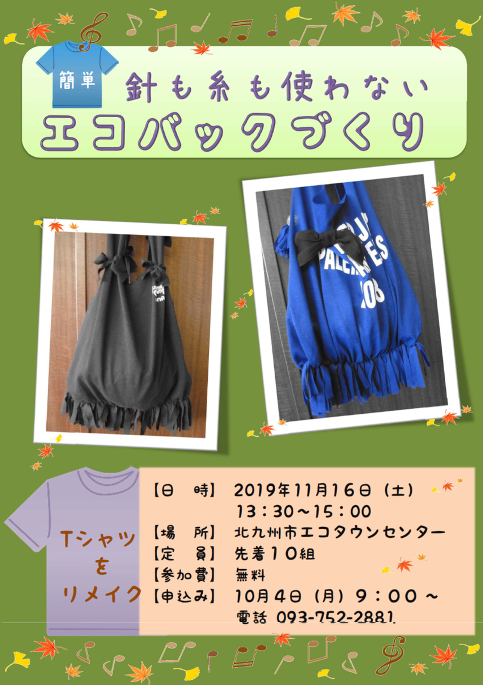 今月のワークショップは、先月に引き続き「針も糸も使わない簡単エコバック作り」です