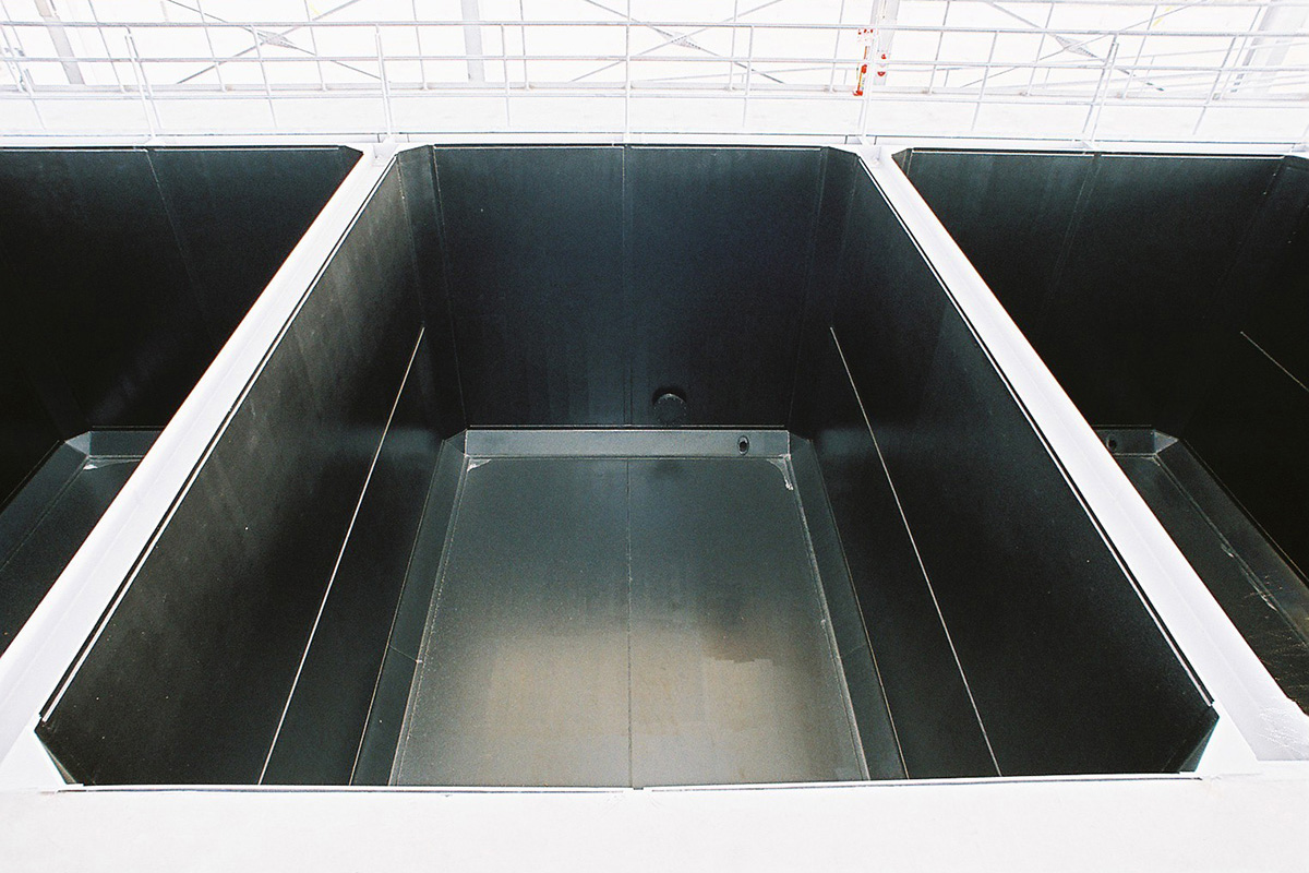 7m×5m×4mの鋼板製の実験槽が7槽あります。実験槽から浸出する排水を処理する施設も完備しています。